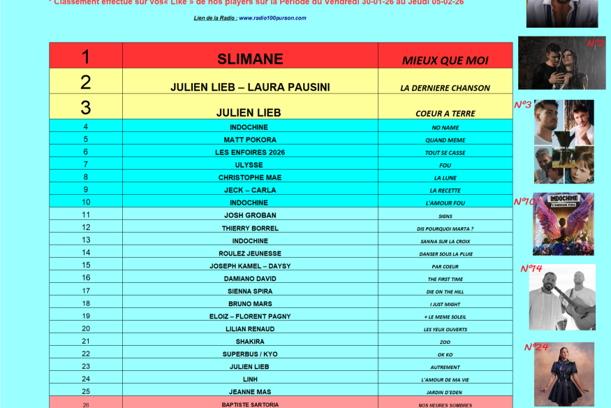 Classement Lik'Hit : Dimanche 01-03-26
