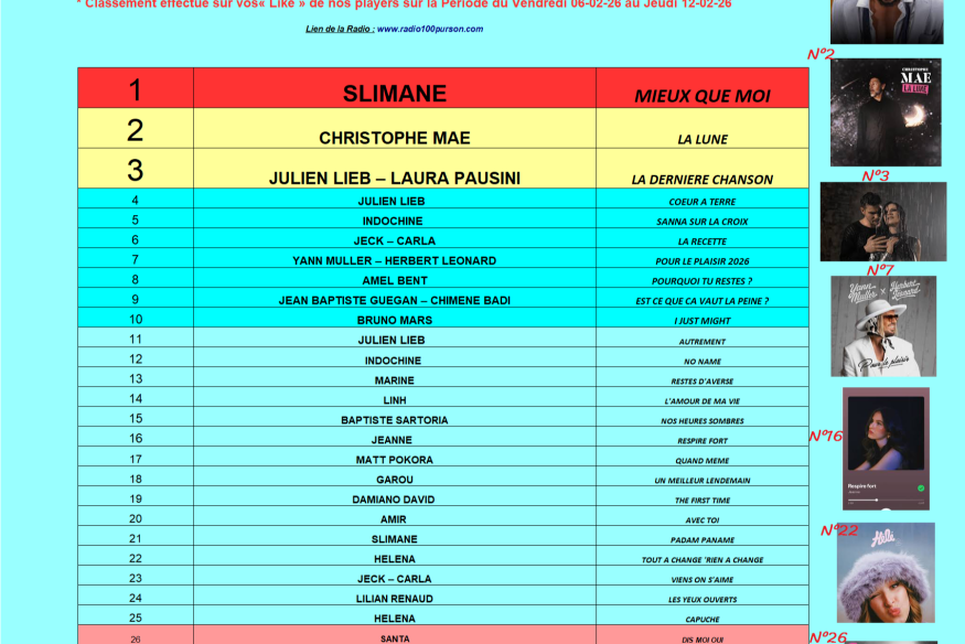 Classement Lik'Hit : Dimanche 22-02-26