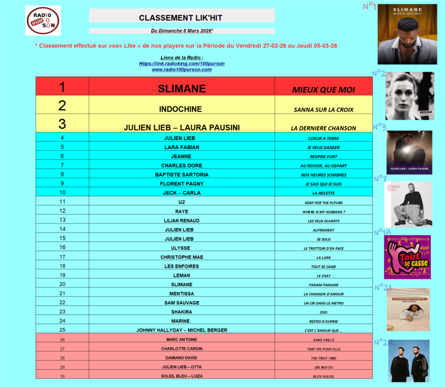 CE CLASSEMENT EST REALISE VIA VOS LIKE SUR NOS LIENS RADIO (Coeur ou Pouce) ! et seulement via ce biais.